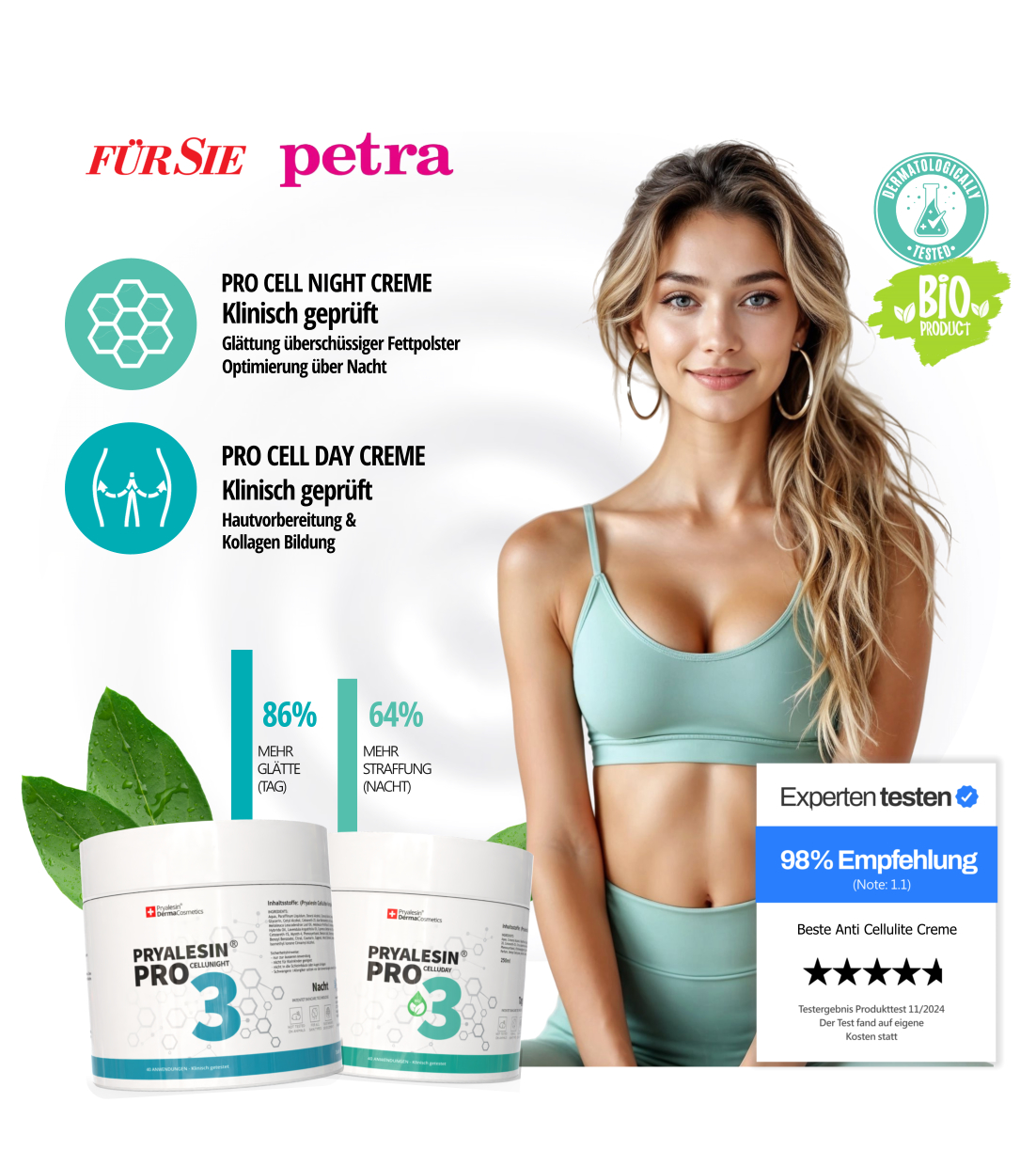 Als Texter und Produkttester bei Experten testen habe ich schon unzählige Anti-Cellulite-Produkte ausprobiert – von günstigen Drogeriecremes bis hin zu hochpreisigen Spezialkuren. Pryalesin 3 setzt sich in unserem Vergleich mit großem Abstand an die Spitze. Der entscheidende Grund: das durchdachte Tag-und-Nacht-Konzept. Statt einer „Alles-in-einem“-Lotion gibt es zwei präzise Formulierungen, die ineinandergreifen: Die Night-Creme bereitet die Haut vor (Poren öffnen, Mikrozirkulation anregen), die Day-Creme liefert am Morgen den intensiven Wirkkomplex in die Tiefe. In der Praxis ist das genau der Unterschied zwischen „nett gepflegt“ und „sichtbar geglättet“.